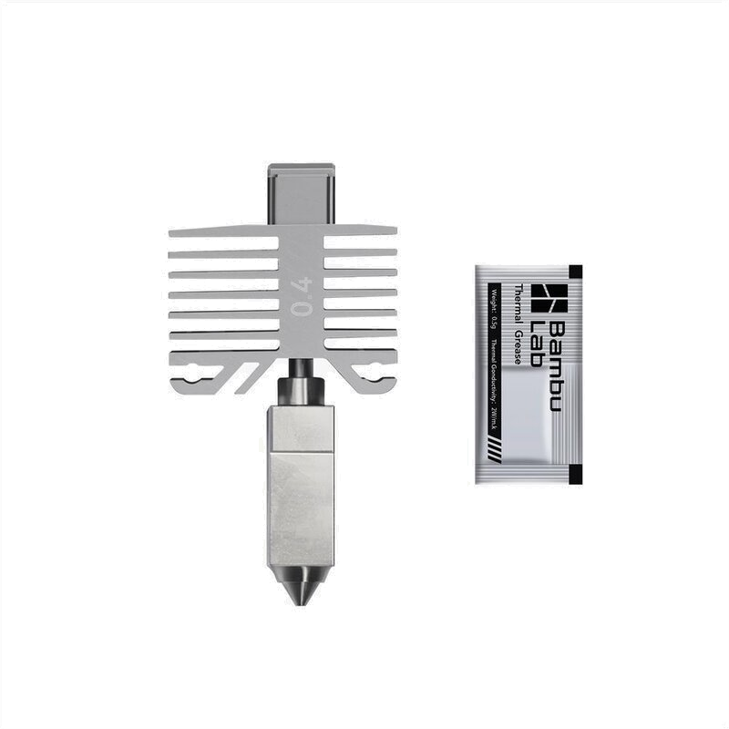 Este hotend de Bambu Lab para las impresoras 3D de la series X1/P1 y A1 viene con diferentes diámetros de boquilla (0.2, 0.4, 0.6, 0.8 mm) y materiales (acero endurecido o acero inoxidable), según las necesidades de impresión del usuario. Por ejemplo, cuando se utilizan filamentos reforzados con fibra, la mejor elección sería una boquilla de acero endurecido con un diámetro de al menos 0.4-0.6 mm para evitar un desgaste excesivo y obstrucciones en la boquilla. Más información sobre la compatibilidad de materiales se puede encontrar en este artículo en el Wiki de Bambu Lab.